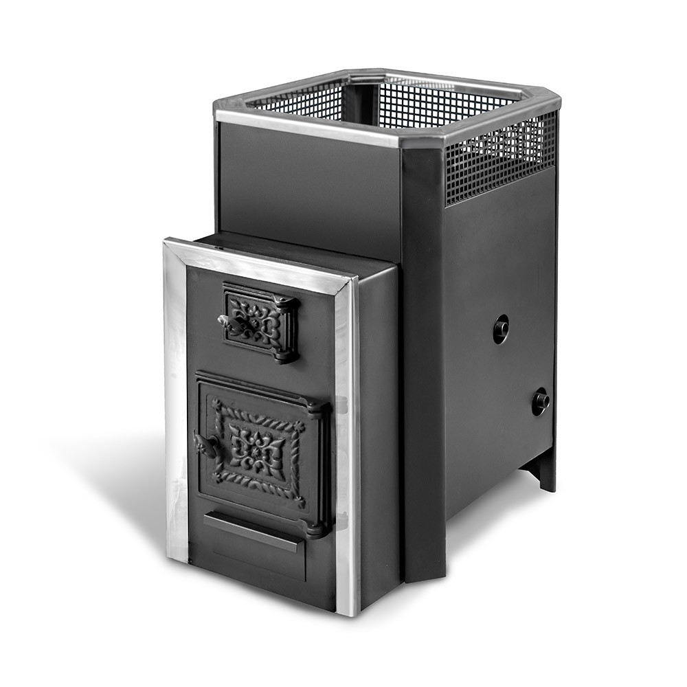 Банная печь имеет предназначение - обогрев парилок объемом до 30 м3. Имеет выносную топку, что позволит вам совершать растопку из соседнего помещения. "Радуга" выполнена из конструкционной стали, толщина стенок - 6мм, верхняя плитка - 8мм. Для нагревания воды используется встроенный теплообменник. С помощью прочистной дверцы можно легко очистить печку и дымоход.Печь с открытой каменкой .Увеличенные дымовые каналы печи граничат не только с камерой каменки, но и с конвекционным каналом. Горячие газы в дымоходе направлены по кругу и даже имеют движение вниз. Двигаясь вниз, они проходят через наиболее раскаленные поверхности печи, где происходит нейтрализация смол и сажи. Удачна в данном случае и геометрия каменки. Влага распространяется по всему объему камеры с камнями, исключая попадание воды на топку и пол. Печь имеет защитный кожух, в котором также заключено несколько положительных моментов. Для увеличения объема каменки кожух выполнен высоким. В верхней части изготовлен из листового материала с отверстиями. Проходя сквозь решетку, пар понижает свою скорость, становится рассеянным, распространяется более равномерно по всем направлениям. Тем самым снижается риск ожогов. Отсутствие острых углов печи исключает травматизм.