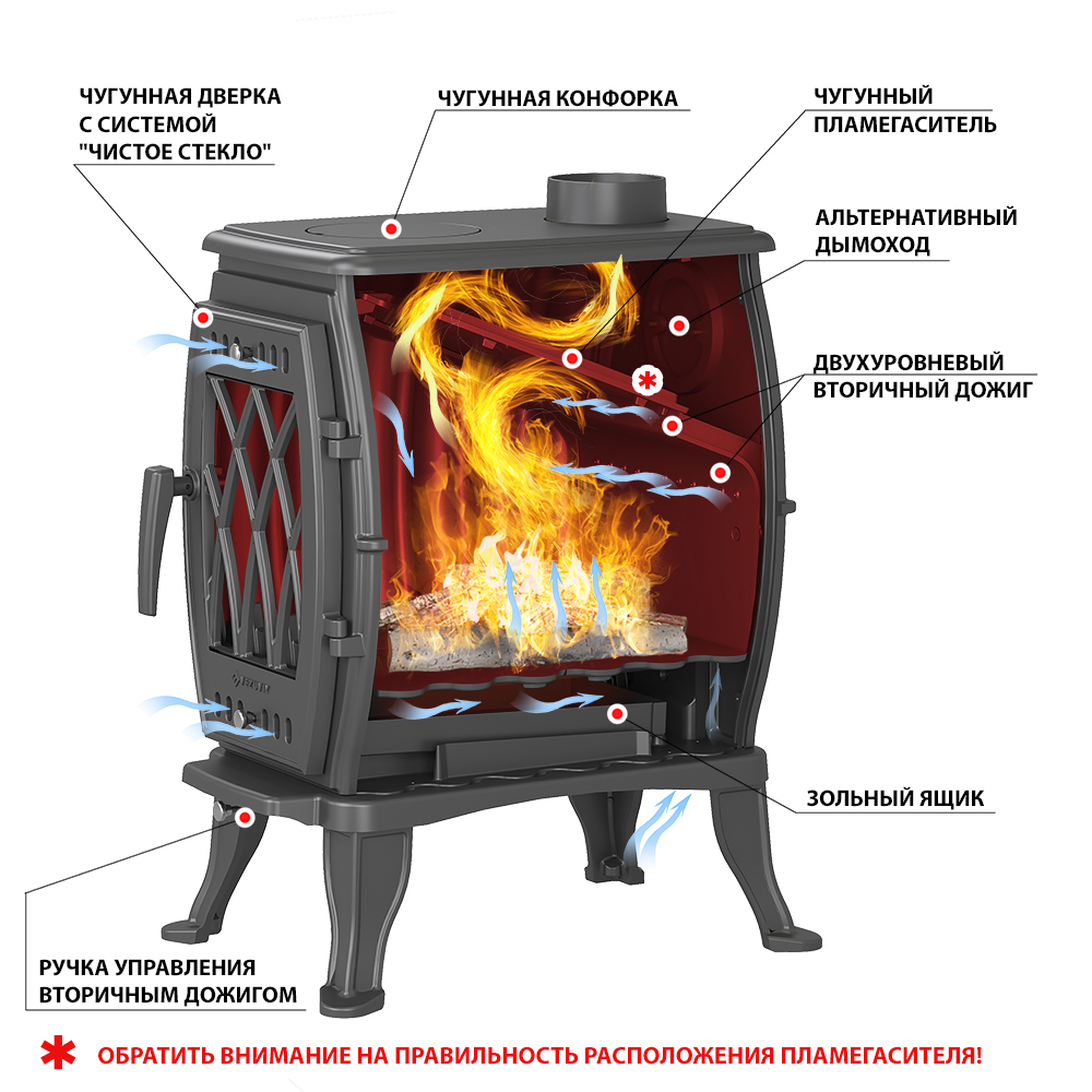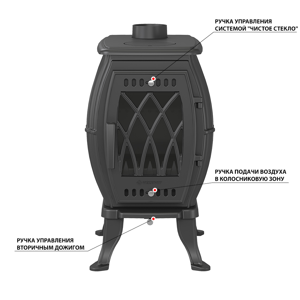 Печь-камин Везувий ВХ-09 "Антрацит" изготовлена из качественного жаростойкого чугуна с толщиной стенок 6-8 мм. Модель рассчитана на обогрев помещений объёмом до 180 м³. Печь-камин имеет пламегаситель изготовлен из чугуна. В Топки печи-камина установлена система двухуровневого вторичного дожига. С помощью этой функции по специальному каналу поступает воздух, который нагревается при прохождении между топочной камерой и задней стенкой корпуса. Далее нагретый воздух через дефлектор поступает в топку, перемешивается с газами - продуктами горения, чем вызывает повторное возгорание. Регулировка этой системы, осуществляется заслонкой, расположенной в нижней части печи-камина. Регулировка подачи воздуха в колосниковую зону осуществляется заслонкой, расположенной в нижней части двери. В верхней части двери расположена ручка регулировки системы чистое стекло, которая помогает оставаться стеклу чистым. Патрубок дымохода Ø 120 мм – универсальный, со сменным положением.
