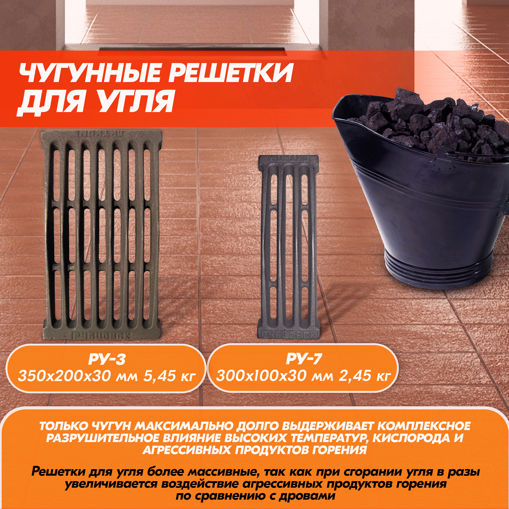Колосниковые решетки для угля изготавливаются более массивными, и они имеют большие по размеру пазы, чем решетки для дров.